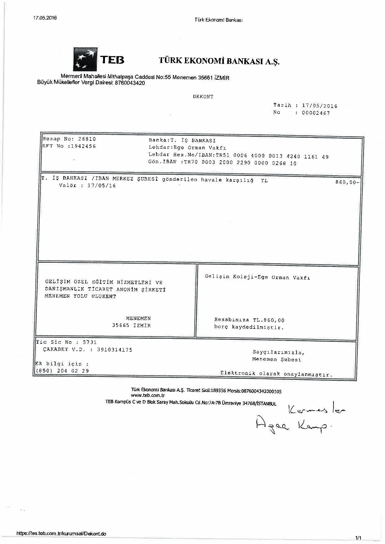 ü 2014 yılında İzmir/Çeşme/Barbaros Köyü mevkiinde 1453 ağaç dikerek 8. GELİŞİM KOLEJİ KORUSU